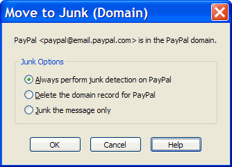 Agent's junk detection utilizes Bayesian filtering to classify junk messages. Bayesian filters are ideal for personal email because you train the filter to recognize exactly what you consider to be junk. Agent's adaptive junk filter is constantly learning to classify new words. Agent also implements "forgetting", a technique for expiring words which are no longer relevant. The result is a junk filter that keeps up with the evolving flow of spam messages. The rules-based filters used by ISPs can't match the precision of Agent's junk filters. Rules work well for the obvious junk. But, rules often generate false positives, valid emails classified as junk. Junk TrainingJunk training is easy in Agent. You simply move messages to the Junk folder by dragging and dropping or pressing Ctrl + J. Agent takes care of the rest. Remove a message from the Junk folder and Agent will reclassify the message as legitimate. Trusted ContactsAgent's junk detection is tightly integrated with Agent's address book and email filters. As a result, Agent can automatically recognize email from trusted contacts and avoid false positives by classifying the message as legitimate. If you try to junk a message from a trusted contact, Agent will ask you for a confirmation. In this example, the user is junking a message from PayPal and Agent recognized PayPal as a trusted domain in the address book. Since the user gets lots of phishing emails with a forged PayPal domain, they've elected to turn on junk detection for the paypal.com domain. Trusted contacts and domains are also used for Route by Identity. |