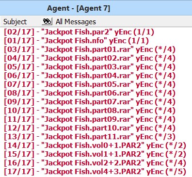 Get headers in a group. Agent, as described above, would join sections to provide individual RAR, Split and PAR files in the Message List pane: